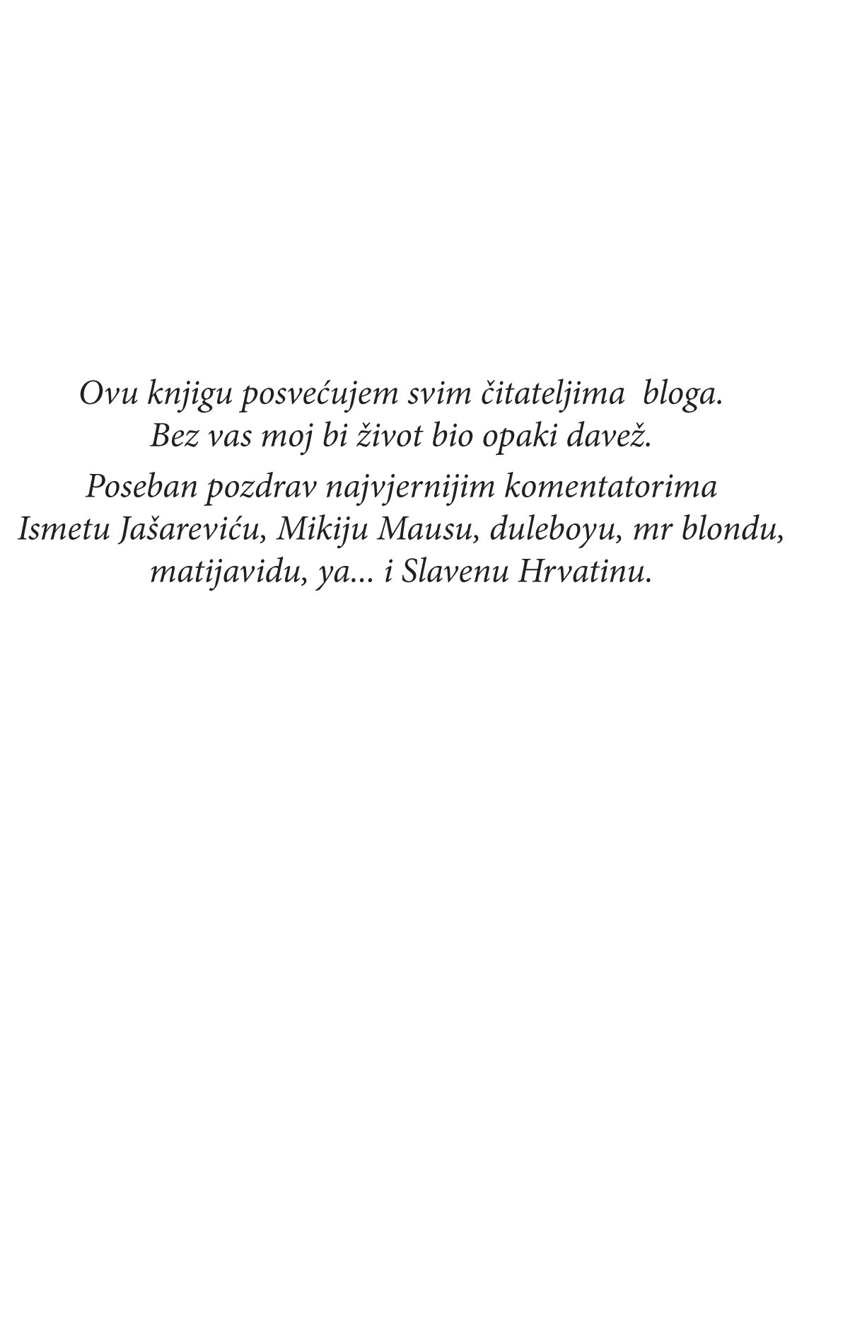 Čestitam na novoj knjizi, jedva čekam da izadje pa da je natenane gustiram i iščitavam. Potpuno ste u pravu, ovi blogeri koje ste naveli su dosta doprineli velikoj posećenosti i iščitavanju Vašeg bloga. Meni posebno nedostaje Matijavid koja se više ne javlja, uživala sam u njenim pisanjima, a pogotovo u pesmama koje je pisala, i zato ako ovo pročita, volela bih da se bar ponekad javi i napiše nešto onako duhovito i dobro kako samo ona to ume.