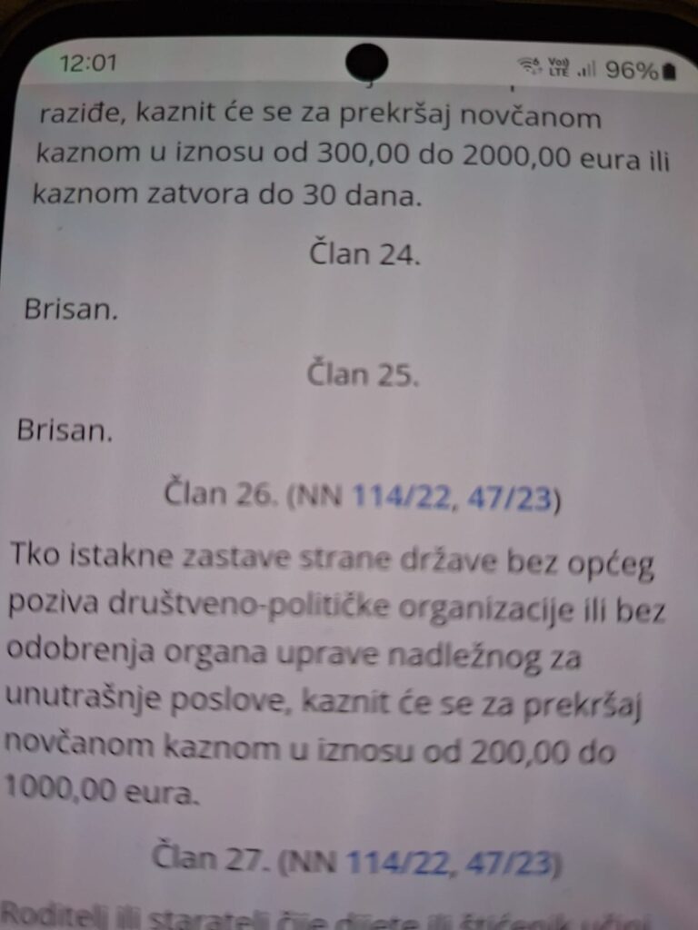 Hrvatska nije priznala Palestinu kao državu tako da njena zastava u ovoj maloj, uređenoj, demokratskoj zemlji ima status krpe za brisanje poda. Ajmo dalje. “Tko istakne zastave strane države bez općeg poziva društveno-političke organizacije… platit će od 200 do 1000 eura…”