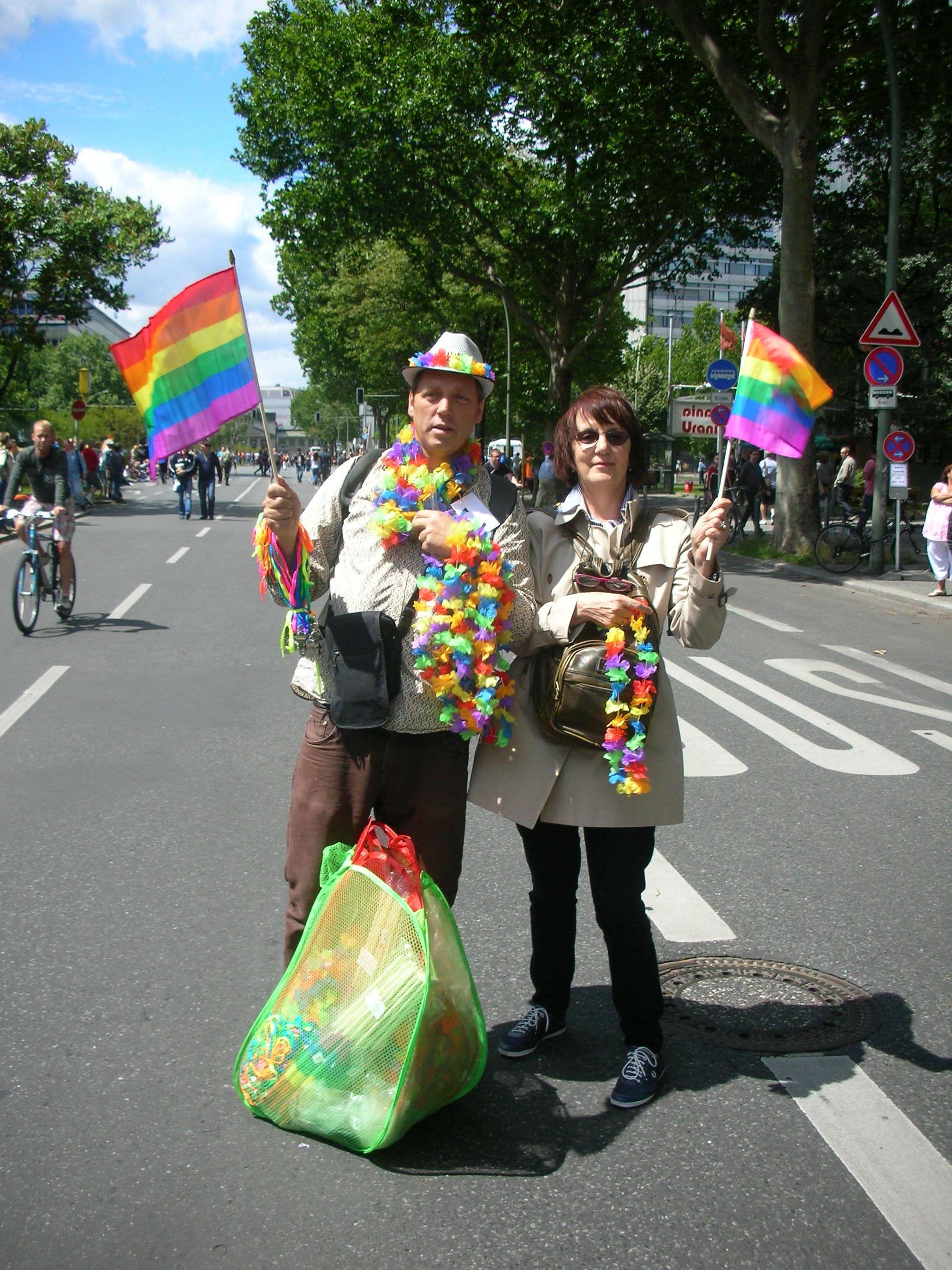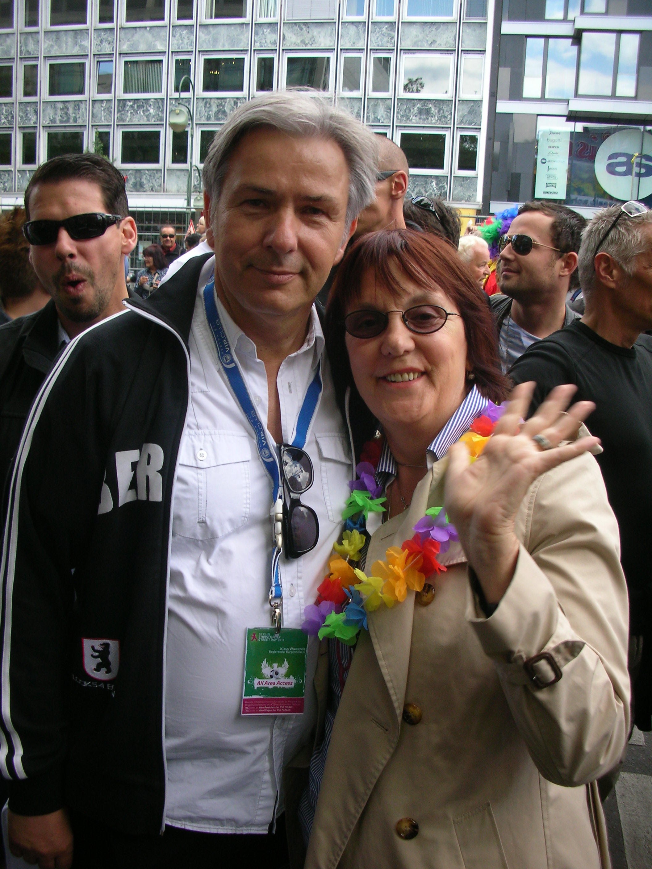 Blaženi internet pa mi morate vjerovati. Fotografirala sam se sa gradonačelnikom Berlina, gospodinom Klausom Vowereitom, koji je gej i koji je također bio u koloni, okružen tjelohraniteljima. Građani su mu se smiješili i pljeskali, ja sam pitala tjelohranitelje da li mu smijem prići, od ljudi uz rub ceste dijelio ga je samo uže, dozvolili su mi, njega sam pitala da li se smijem s njim slikati… I evo nas dvoje kako se smiješimo zagrljeni.